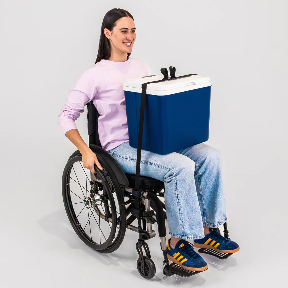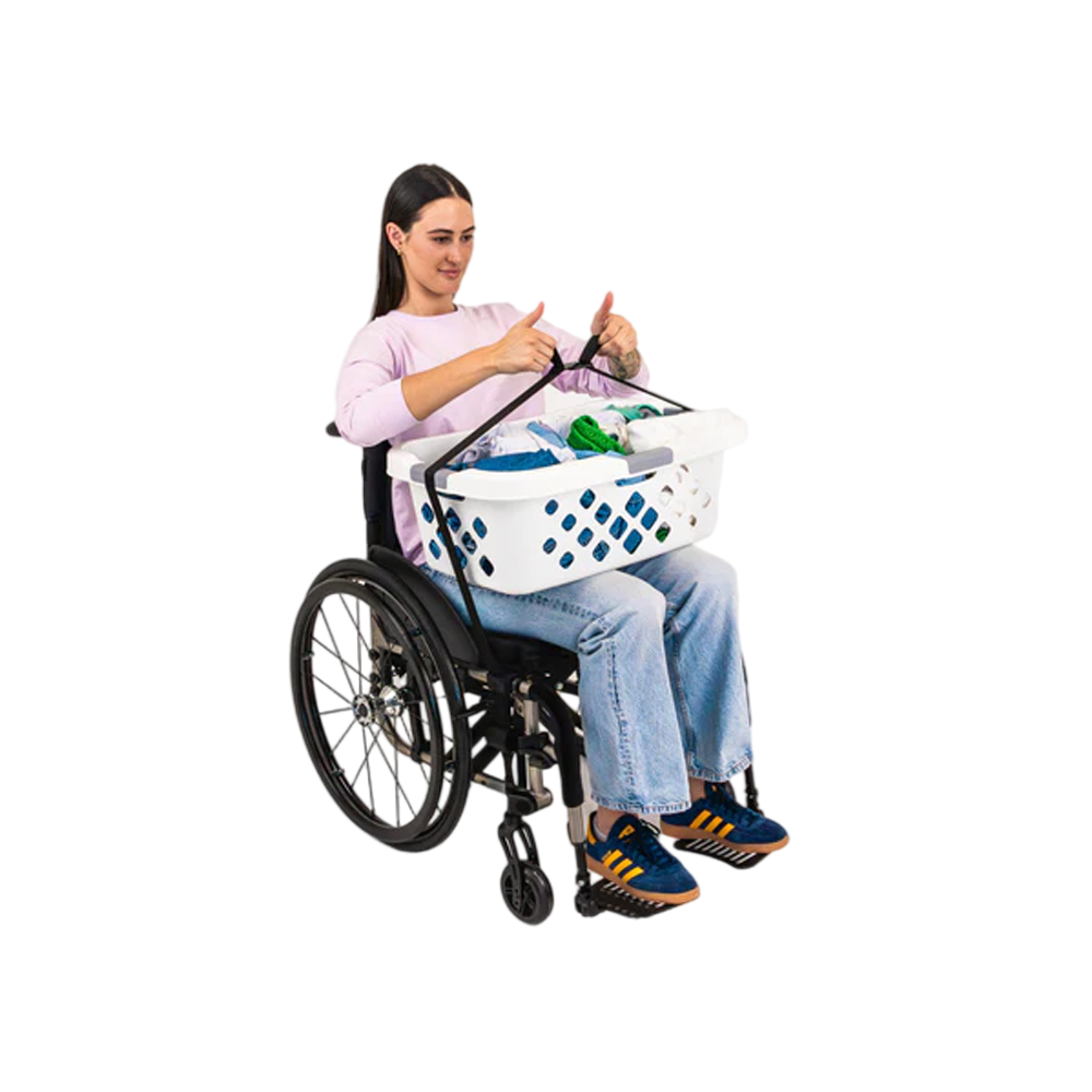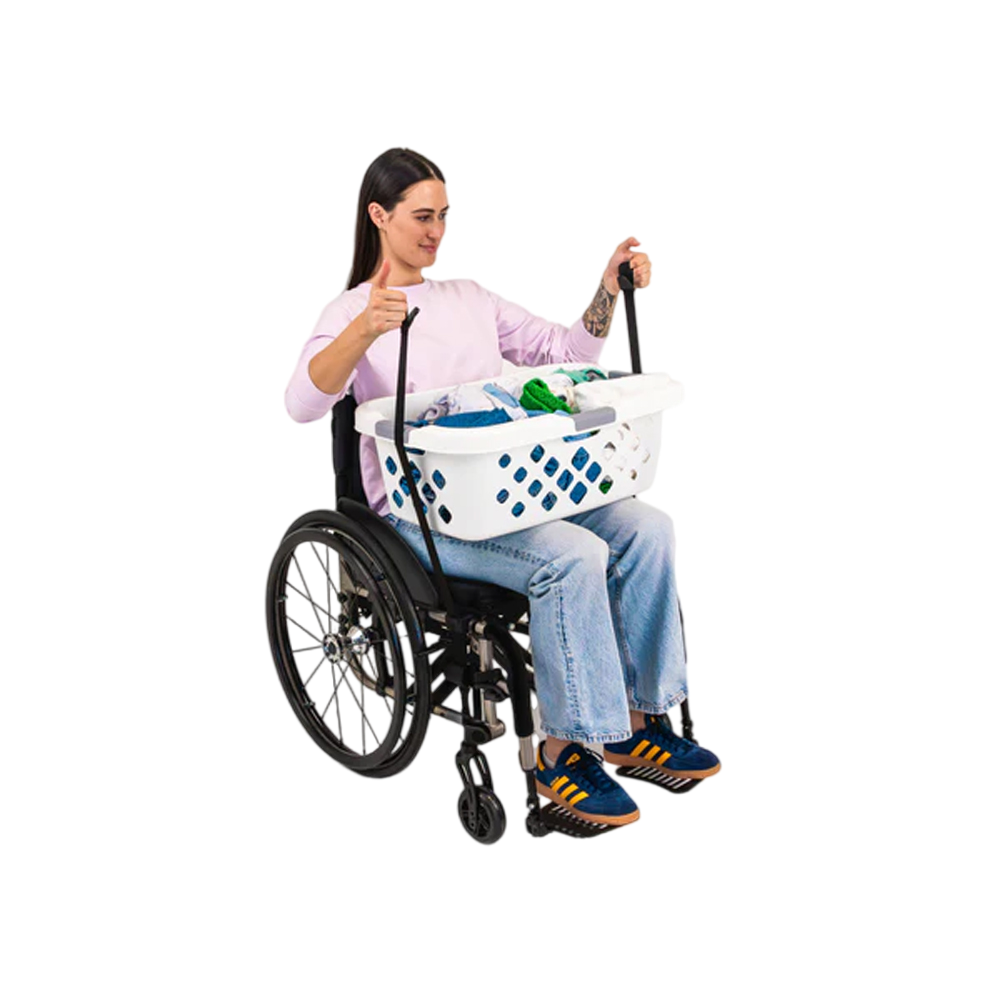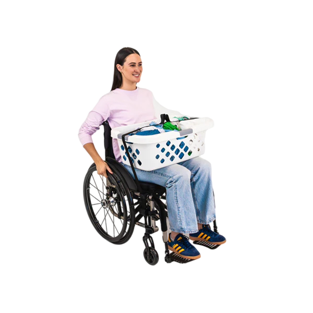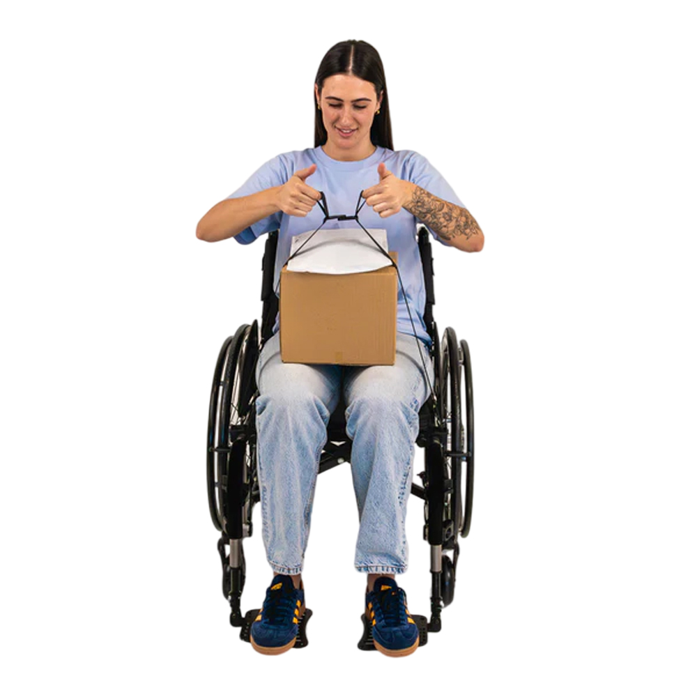 The Adaptdefy LapStacker is a retractable carry system for wheelchairs designed to help users transport belongings securely and easily. Key features include a magnetic buckle system and finger loops for easy use, especially for those with limited hand function. Its lightweight and discreet design is intended to complement the user’s wheelchair, boost independence, and prevent dropped or damaged items.