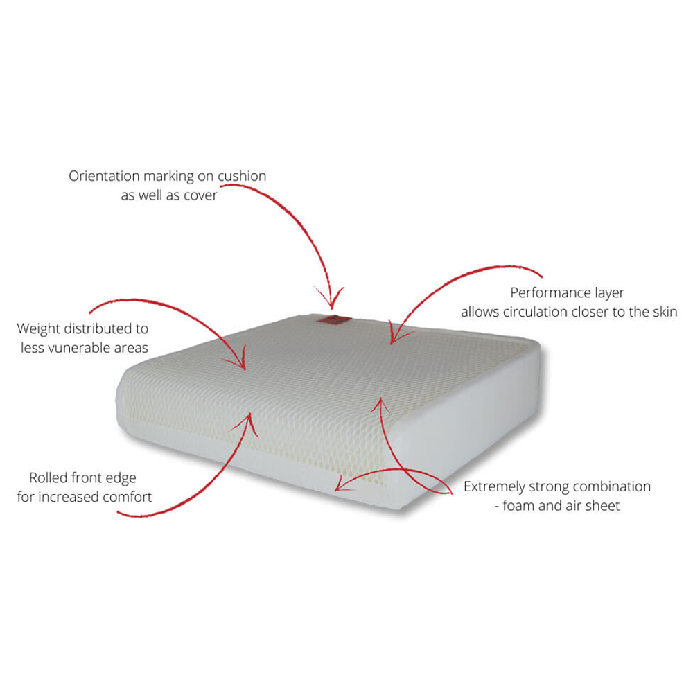 The ClimaZone cushion’s design weight distribution to less vulnerable areas, a rolled front edge for increased comfort, a performance layer that allows better circulation closer to the skin, and an exceptionally strong combination of foam and air sheet. These features work together to enhance user comfort, reduce pressure on sensitive areas, and promote better overall support for wheelchair users during prolonged sitting. Orientation marking on cushion as well as cover ensure the correct placement.