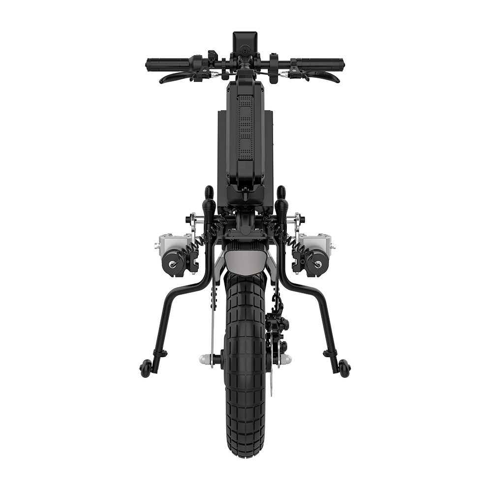 - Manual clamps – line up your wheelchair and push the long levers to clamp the PAWS on. Push forward on the handlebars to lift the front of your wheelchair off the ground, and you’re ready to go!