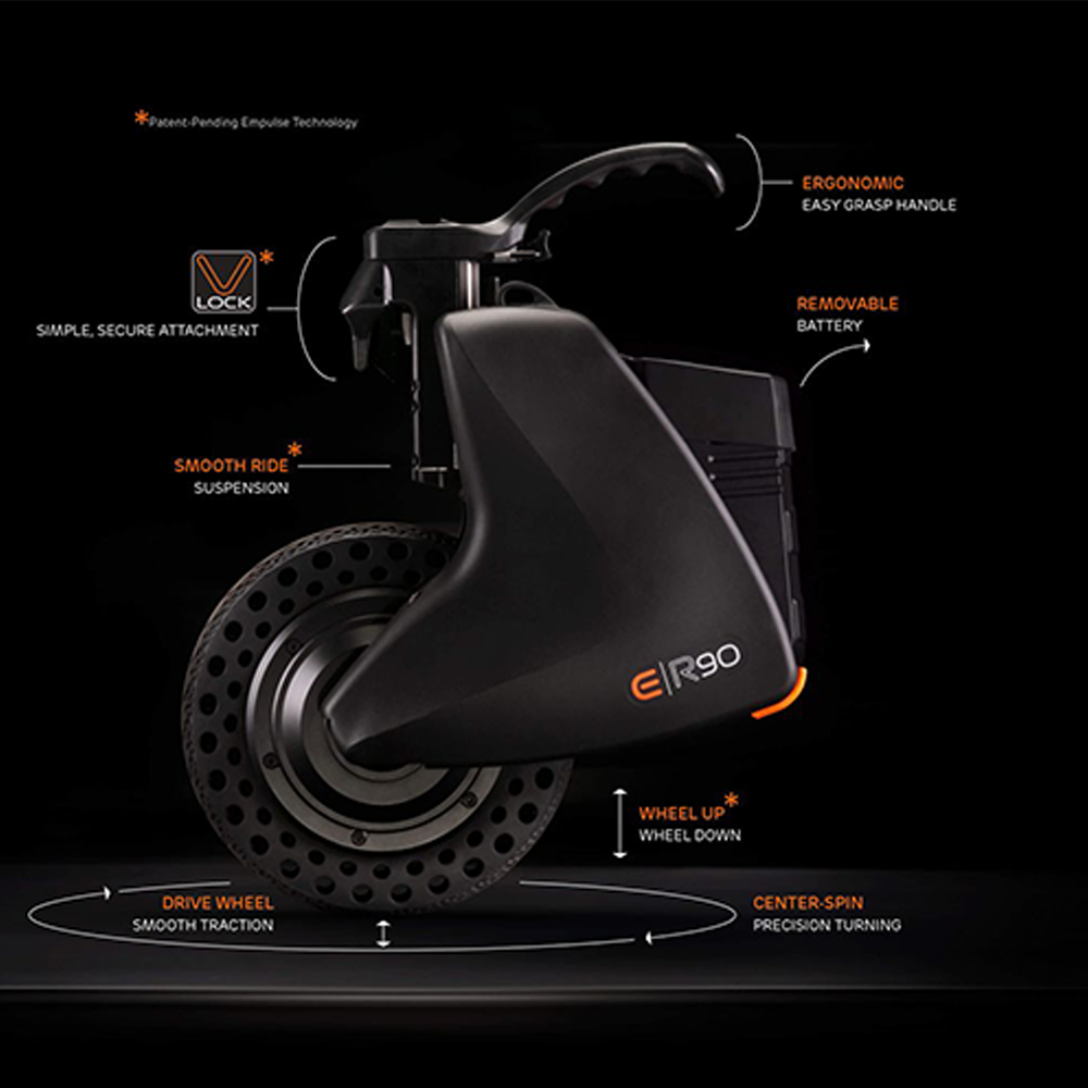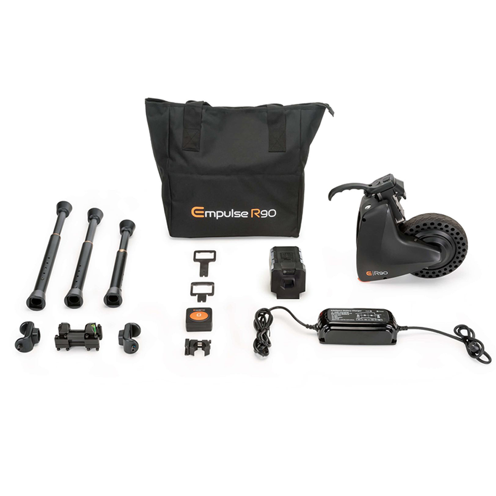 Reimagine your ride with the Empulse R90, designed to fit most rigid and folding wheelchairs. A durable yet lightweight bracket is fastened to the chair and remains on the chair while the R90 can be easily detached.