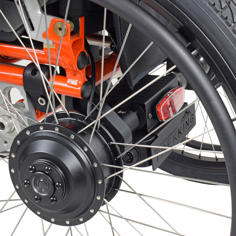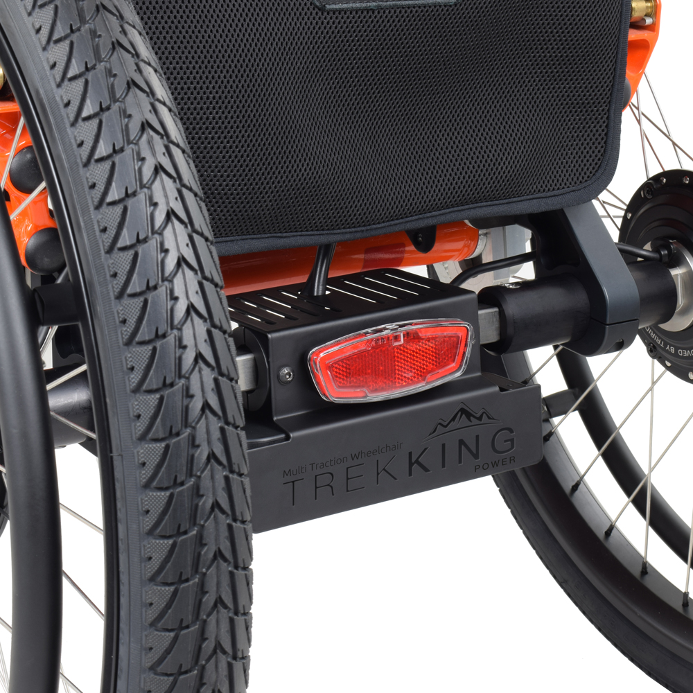 Kit with self-supporting frame, structurally independent from the wheelchair frame. Combined with Triride motors, it allows you to have a high-performance three-wheel electric vehicle. Drive Units also individually selectable front only, rear only or all three at the same time with a power splitter between front and rear. The Trekking Power kit attaches and removes in a few seconds, returning the wheelchair to its original state without any structural changes.